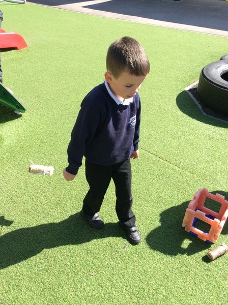 In our outdoor area we sent cars down ramps and measured the distance they travelled. We also practised throwing bean bags, balls and paper aeroplanes and used the language of distance; near, nearest, further, furthest. In the water tray we have revisited the language of capacity.